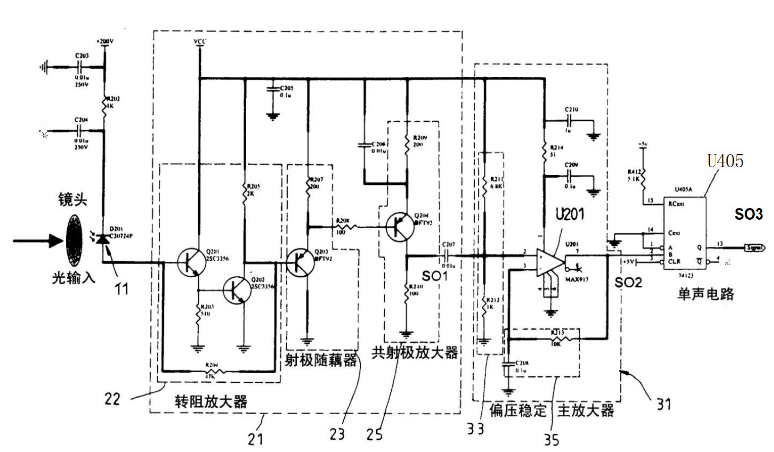 Transimpedans Amplifikasyon Aşaması: Bu aşama, fotosensitif elemana bağlandığında, fotosensitif elemandan gelen akım sinyalini bir voltaj sinyaline dönüştürür. Transistörler Q201 ve Q202, dirençler R203 ve R205 tarafından oluşturulan bir transimpedans amplifikatörü içerir. Bu amplifikatöre bağlı bir emitör takipçisi kuplörü transistörler Q203 ve dirençler R207 içerir. Transistör Q204 ve dirençler R209 ve R210'dan oluşan ortak bir emitör amplifikatörü daha sonra ana amplifikasyon aşamasına sinyal iletimi için bu kuplöre bağlanır.